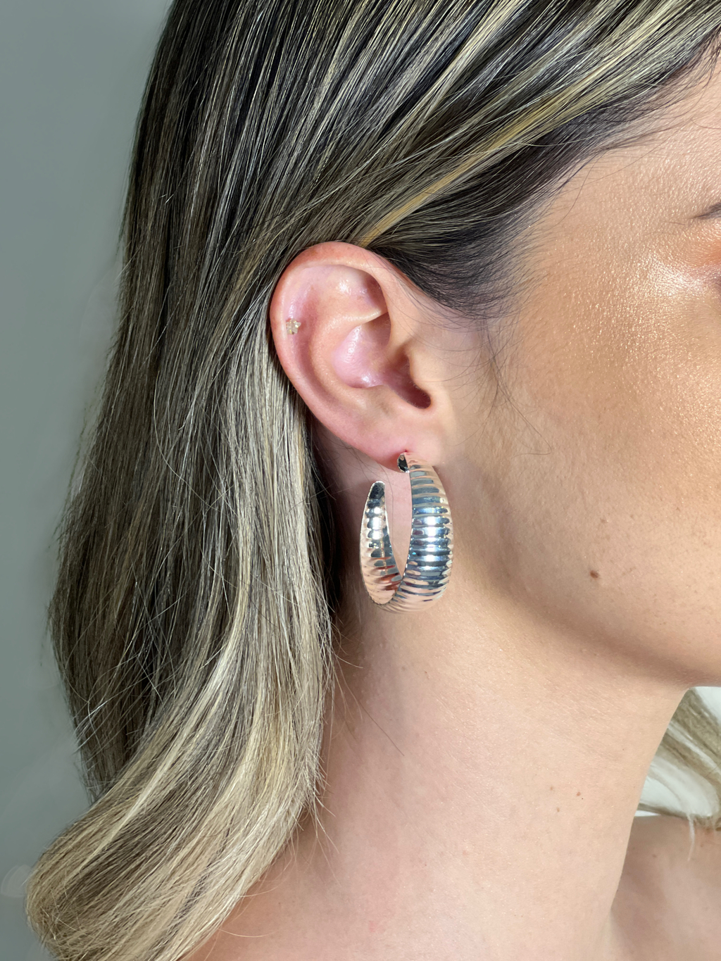 Essa argola banhada em prata é uma peça moderna e cheia de personalidade. Com uma textura única, sua superfície combina detalhes finos e relevos suaves que criam um efeito visual sofisticado. O design moderno traz linhas levemente curvas e assimétricas, dando à argola um ar contemporâneo e exclusivo. O acabamento polido realça o brilho da prata, enquanto a textura adiciona profundidade e estilo. Ideal para quem busca um acessório marcante, essa argola combina perfeitamente com produções elegantes e descontraídas, oferecendo uma dose de originalidade e estilo.