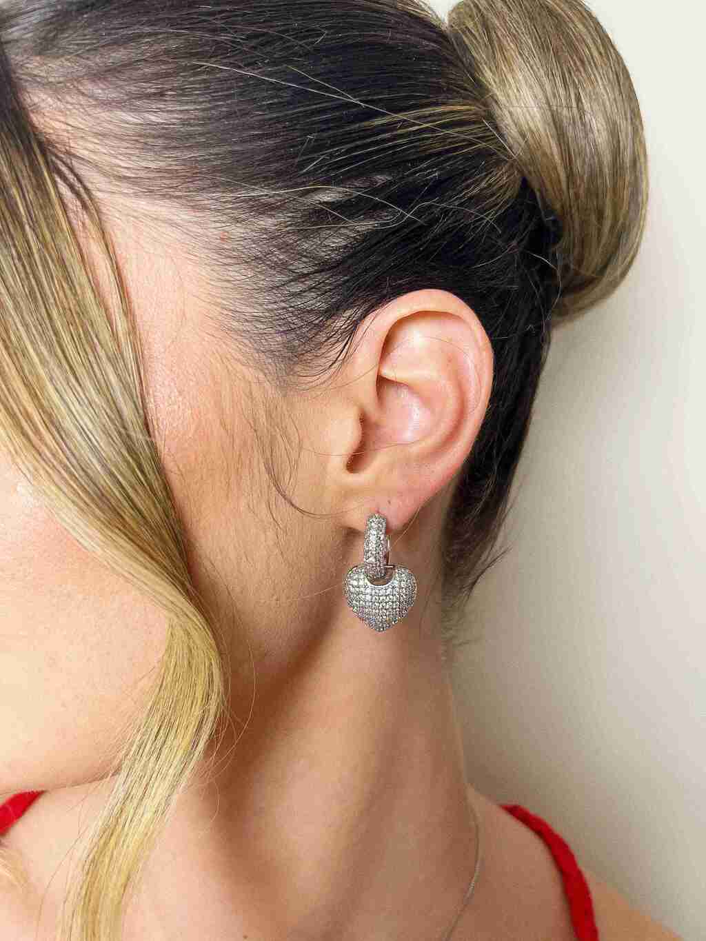 O brinco, por sua vez, é versátil e prático. Ele vem com o mesmo design de coração cravejado, mas também pode ser usado de maneira mais discreta, sem o pingente, apenas com a argolinha, oferecendo duas opções de estilo em um único conjunto. Essa versatilidade permite criar diferentes looks, adaptando-se tanto a momentos mais casuais quanto a eventos formais.